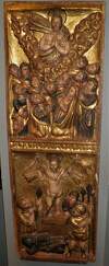 Probablement d'un retable dédié à la vie du Christ. Il a deux scènes. Dans la partie inférieure, Jésus est ressuscité et triomphant dans les cieux pour les soldats romains, et dans la partie supérieure, il apparaît aux disciples, y compris à la Vierge Marie. 132 x 45 cm